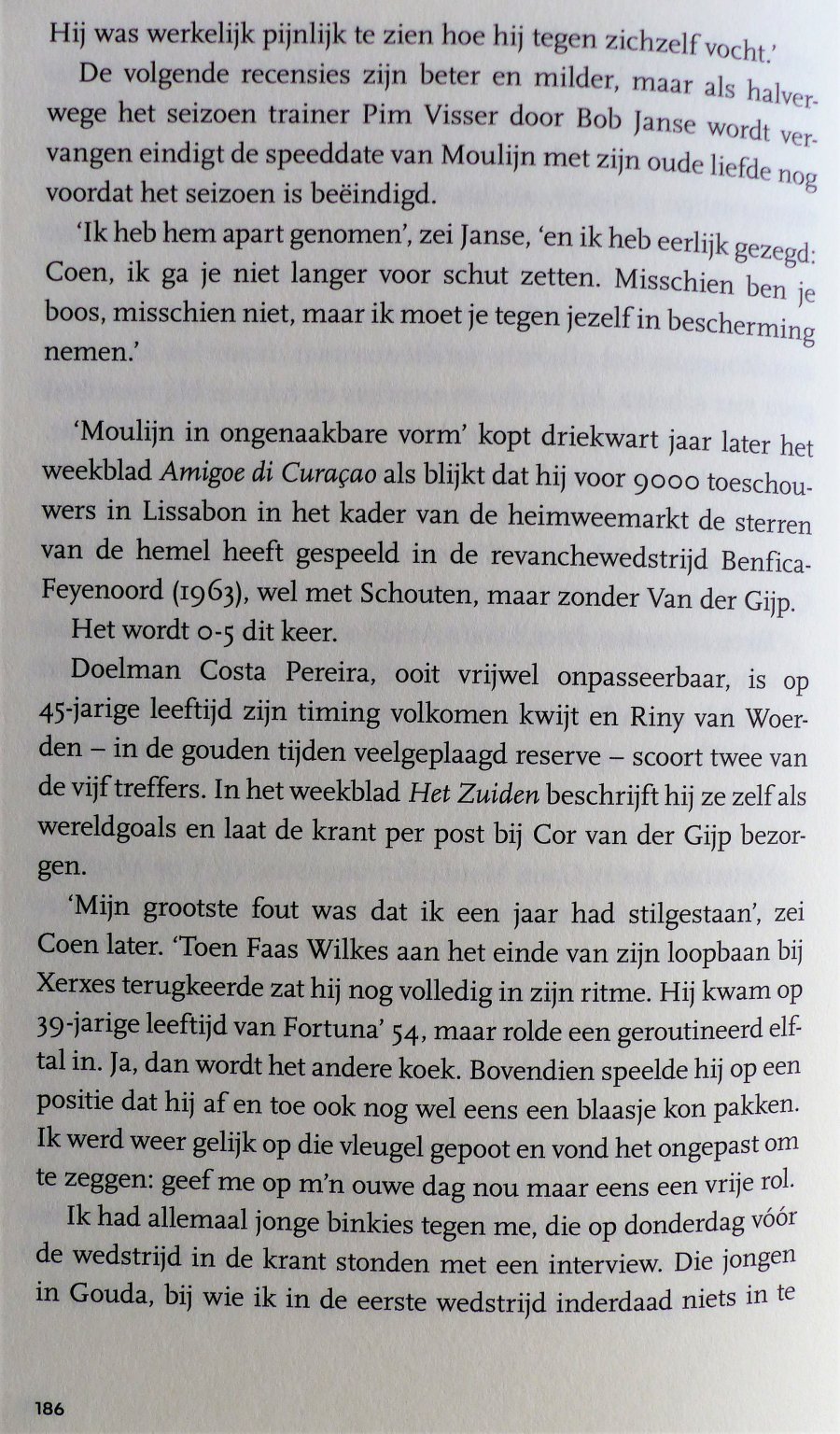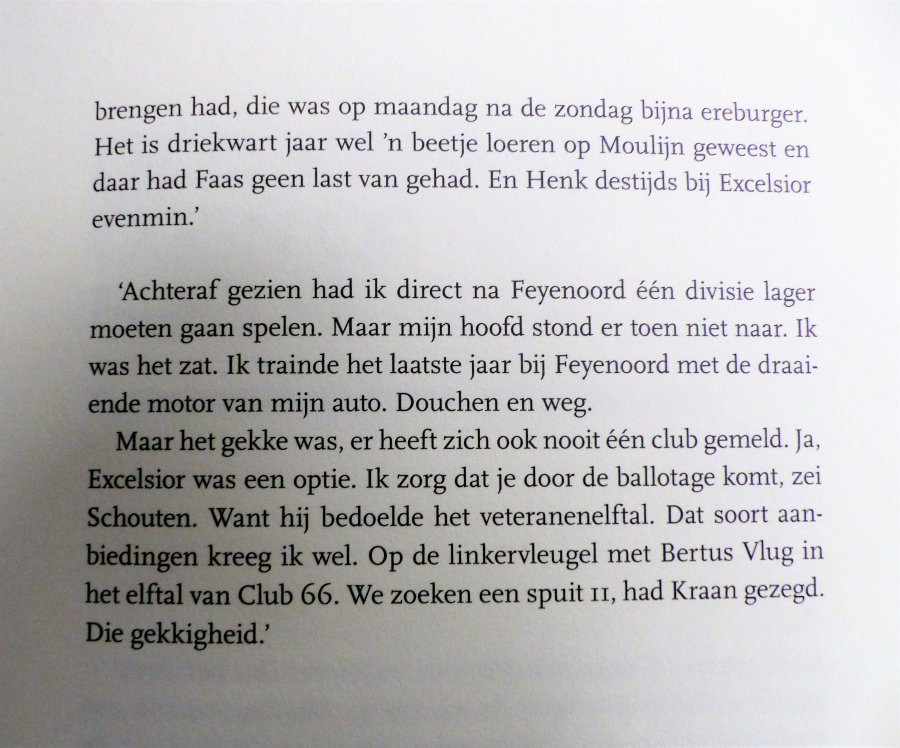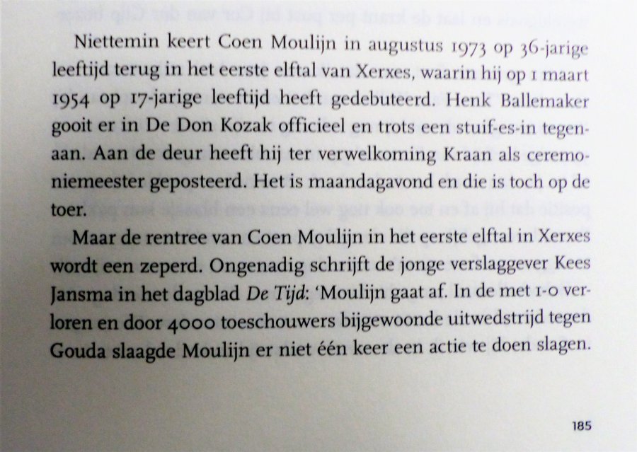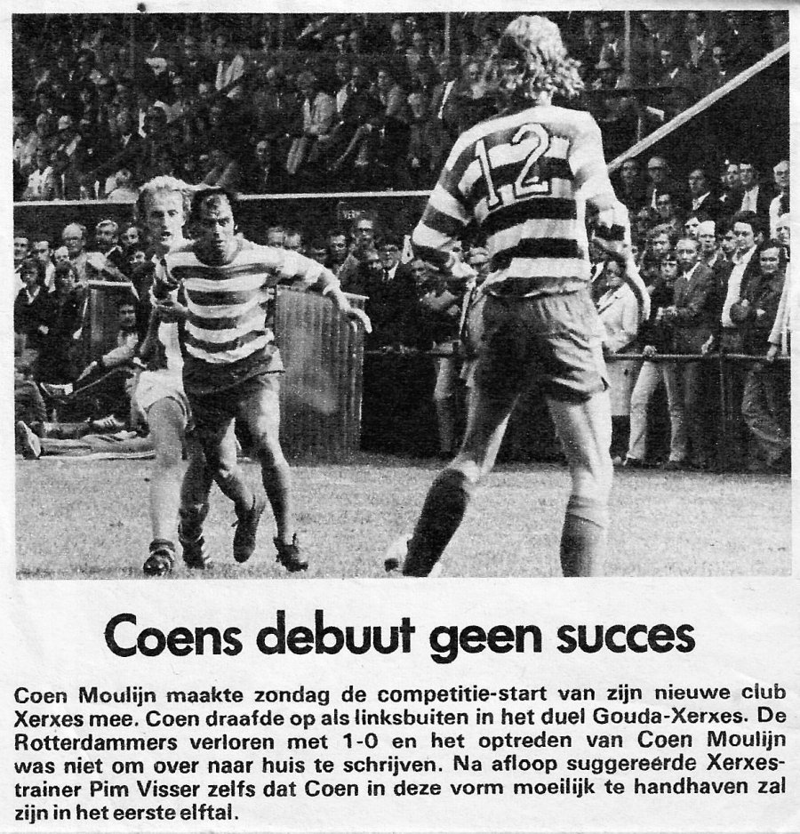 Onderaan deze pagina de strofen uit dit boek die betrekking hebben op de wedstrijd tegen Gouda. Coenraadt Moulijn (15/2/1937 - 4/1/2011), de gevoelige grootmeester op links met zijn meesterlijke dribbel en voorzet, nam zoals gezegd halverwege 1972 afscheid. Als international in De Kuip in 1969 met een bloedeloze 0-0 in de interland tegen Uruguay en bij Feyenoord in 1972, na een seizoen waarin Feyenoord tweede werd. Coen speelde 487 wedstrijden in het eerste van Feyenoord en maakte daarin 84 doelpunten.