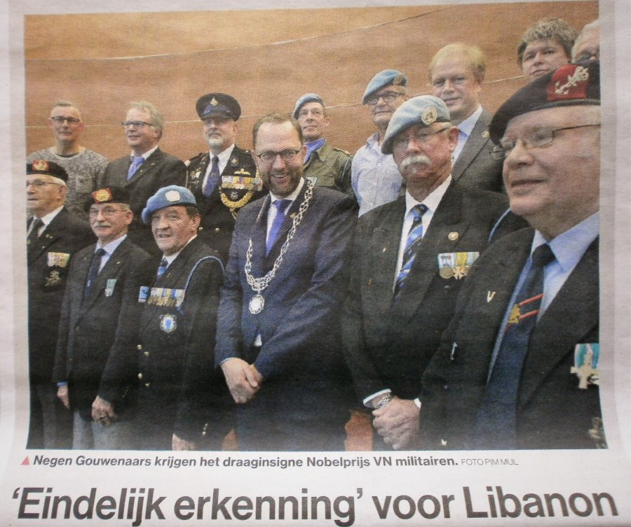 Tot slot een wat vrolijker bericht. Ons lid Hans Dijstra heeft tezamen met een achttal andere Gouwenaren van burgemeester Milo Schoenmaker op donderdag 23 februari 2017 het draaginsigne Nobelprijs VN militairen opgespeld gekregen. In 1988 werd de Nobelprijs voor de Vrede toegekend aan dertien VN-vredesmachten die in de periode 1948 tot 1988 een vredesoperatie uitvoerden. Hierop gebaseerd en als erkenning voor de in deze periode uitgezonden Nederlandse (oud) militairen, besloot defensie minister Jeanine Hennis - Plasschaert in 2015 om het draaginsigne Nobelprijs VN militairen in te stellen. Verreweg de meeste rechthebbenden op het draaginsigne maakten met gevaar voor eigen leven deel uit van de vredesmissie Unifil in Libanon. Hans was één van hen en wij feliciteren hem van harte met deze waardering gekregen voor inzet ver van huis voor vrede, vrijheid en veiligheid.