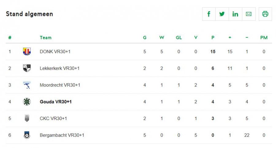Na twee uitronden voor het eerst een thuisronde. De tweede ronde op vrijdagavond 21 september bij Moordrecht werd afgebroken vanwege het noodweer. Gouda speelde toen maar 1 potje tegen koploper DONK (0-1). Vrijdag worden er gelukkig betere weersomstandighden verwacht. Succes en veel plezier dames!