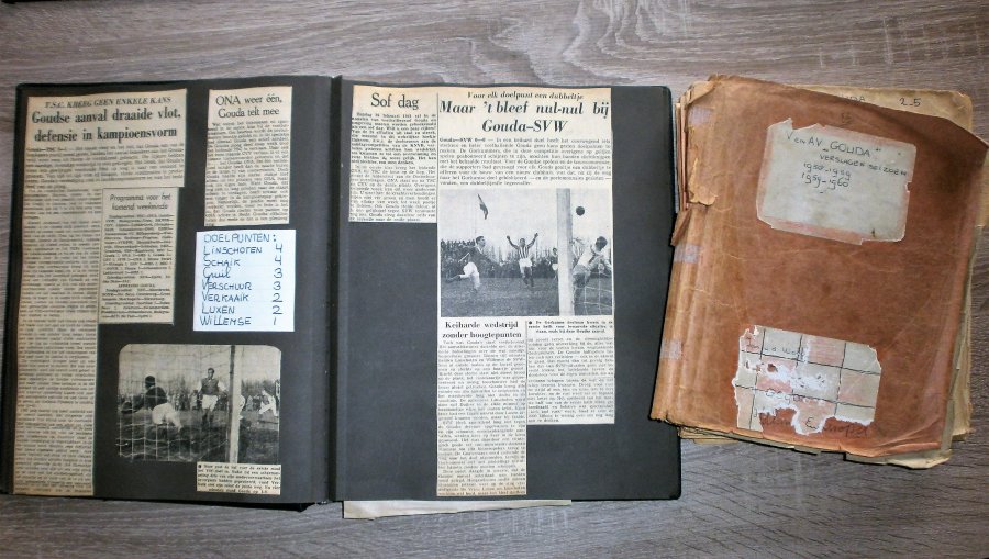 Als u nog oude spullen van de SV (V&AV) Gouda heeft, gooi ze dan niet weg! De vereniging neemt ze graag in ontvangst of haalt ze op. Het kan om van alles gaan en het hoeft niet perse heel oud te zijn. Hans Brouwer en Hans Sanders verzamelen voor de vereniging onze historie vanaf 1906 tot heden en hebben inmiddels al een archiefladenkast vol. Daaruit zijn de collage's in het clubhuis aan de achterwand voortgekomen en over enige tijd zal er een vitrine in het clubhuis geplaatst worden, gevuld met stoffelijke herinneringen, een soort "Hall of Fame" en die vitrine moet dus ook gevuld worden met voorwerpen en foto's. Wellicht heeft u ook iets voor deze permanente tentoonstelling, al dan niet in buikleen. Neem voor de oude Gouda-spullen even contact op met de vereniging of deze heren; wij zijn u dankbaar!