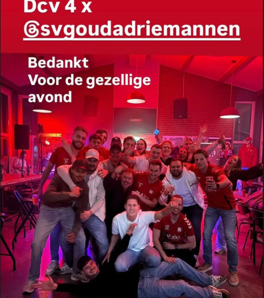 - Gouda 3 - DCV 4 3-2. In een spannende wedstrijd won het Derde van de koploper en steeg weer naar plek 3. Een feestelijk gebeurtenis die het derde, met tegenstander DCV 4, vierde in de feestelijk afterparty onder de naam Super Zaterdag, met DJ Rens.