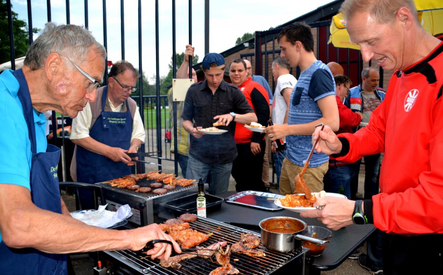 Na de wedstrijd was het tijd voor een hapje en een drankje, waarbij de voortreffelijke ambachtelijke slager Van Sprang, ook flink geworteld in de SV Gouda, veel kwaliteit op het hete rooster bracht, waarvan volop gesmuld werd.
