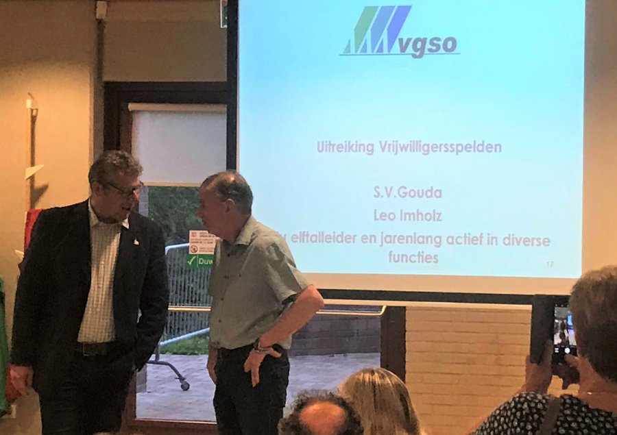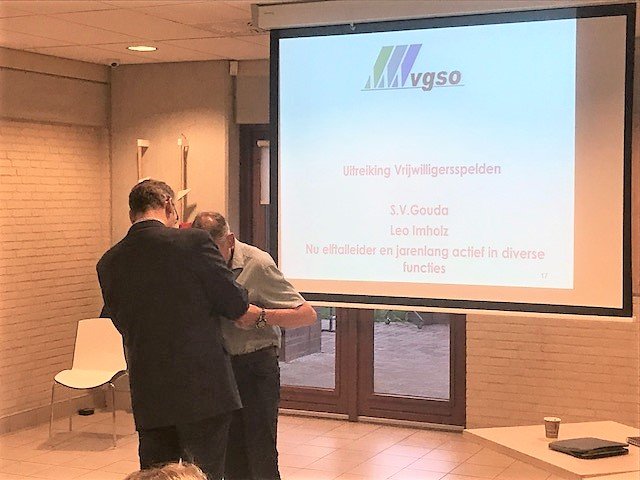 Op dinsdag 4 juni 2019 kreeg ons lid Leo Imholz tijdens de ALV van de Vereniging van Goudse Sportorganisaties door Wout Schonewille, lid van de Goudse gemeenteraad, wegens zijn vele en jarenlange verdiensten voor de SV Gouda, de Vrijwilligersspeld uitgereikt.