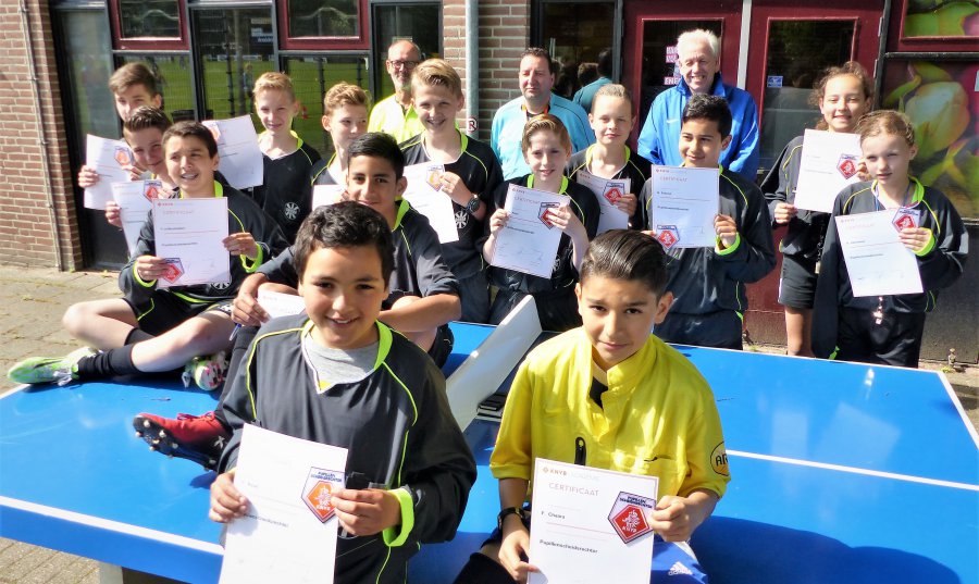 Na het praktijk gedeelte werden aan alle 14 deelnemers (2 meiden, 12 jongens) één voor één met opmerkingen van KNVB- docent Teo Oortman het diploma pupillen-scheidsrechter (met het KNVB-scheidsrechters embleem), uitgereikt. De door onze Theo Franssen georganiseerde cursus leverde louter geslaagden op en Teo Oortman hoopte dat hier wellicht een nieuwe Bjorn Kuipers tussen zat en feliciteerde alle geslaagden van harte.