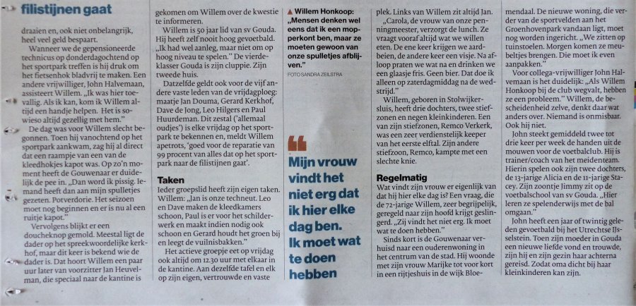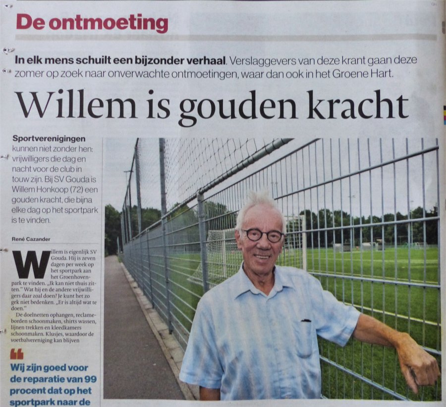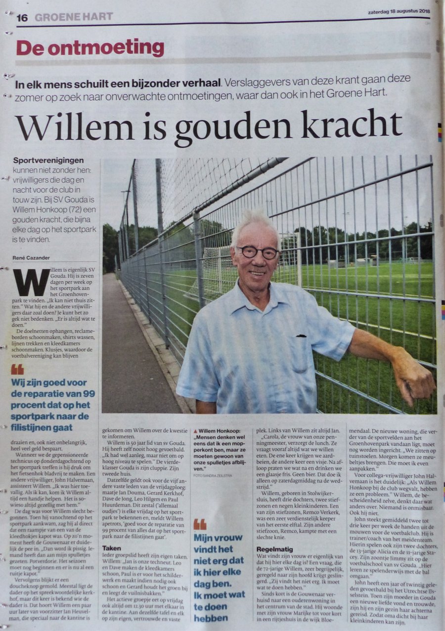 Vandaag, zaterdag 18 augustus 2018, beslaat een interview met ons erelid Willem Honkoop de gehele achterpagina van het regiokatern Groene Hart Gouda. Een interview met onze favoriete "mopperkont" in de serie "Ontmoeting', waarin Willem en met hem de vrijdagploeg, onder de aandacht gebracht wordt van het Goudse lezerspubliek.