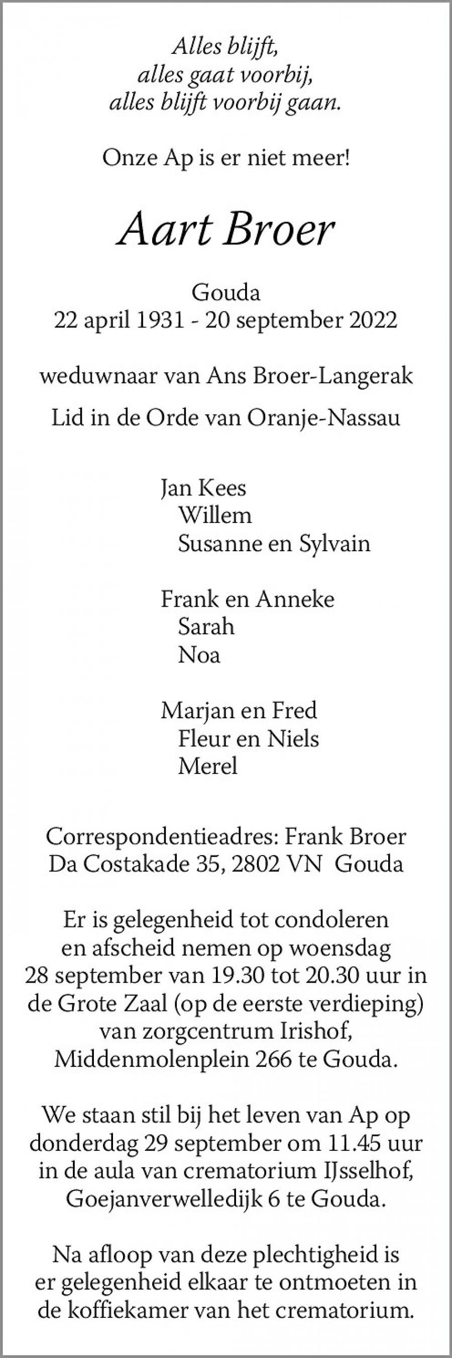 Oud Gouda-man Aart Broer (91) overleden |