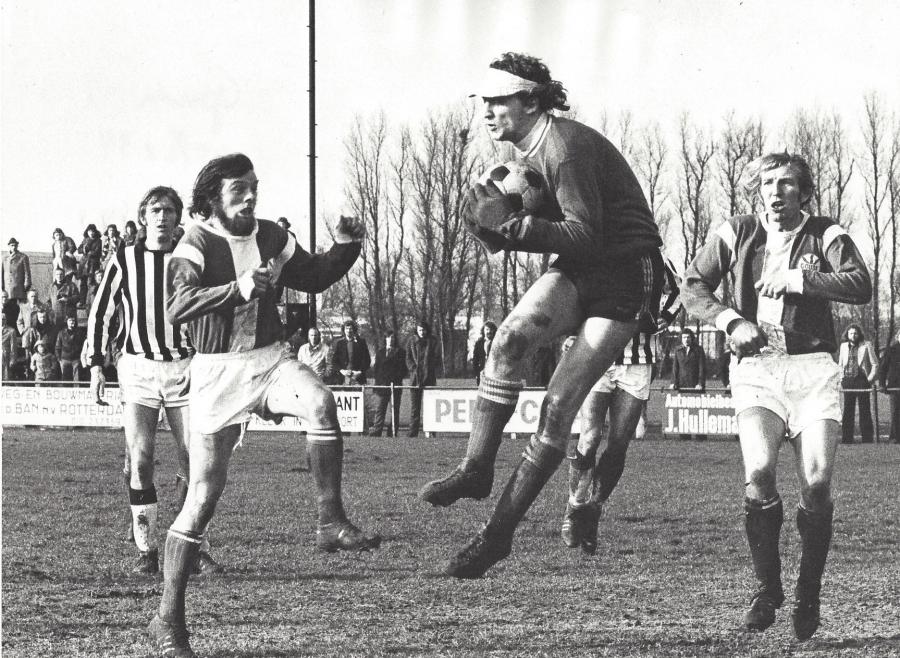 Hans Brouwer en Puck Pols (rechts) op het Gouda-veld aan de Nieuwe Vaart in actie tegen VUC (1974)