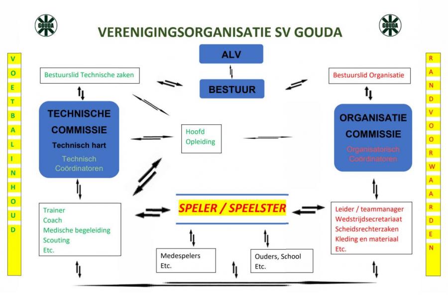 in deze bijzondere tijd wordt er achter de schermen gewerkt aan een nieuwe structuur binnen SV Gouda. Momenteel heeft de vereniging nog een jeugd-/zaterdag commissie (voorheen zelfs ook een zondag commissie). We werken nu aan een organisatie die voor de gehele vereniging, los van leeftijd, geslacht en dergelijke, eensluidend is. Doel wat we daarmee nastreven is dat er binnen de vereniging optimale samenwerking ontstaat op organisatorisch en technisch vlak, waarbij het lid altijd centraal staat. In het schema hieronder is dit op een summiere wijze weergegeven.