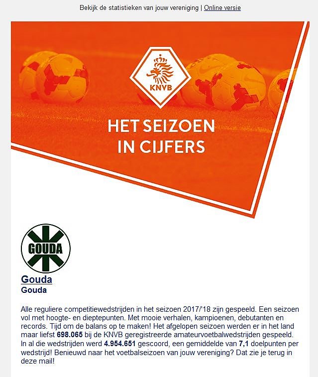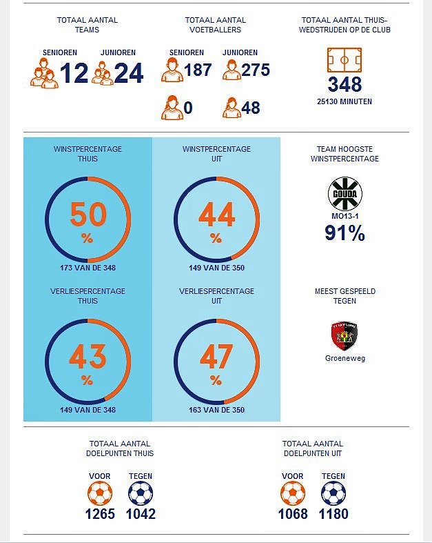 Hier de "stats" zoals aangeleverd door de KNVB. Op zich leuk, maar kloppen hoeft het niet. Zo is Gouda MO11-1 zonder enig puntverlies kampioen geworden (10 gespeeld, 30 punten= 100%) en toch staat MO13-1 als team met het hoogste winstpercentage genoteerd. Dat geeft dus te denken over de waarde van de rest van de cijfers. Maar we gaan ze niet controleren en het algemene beeld zal waarschijnlijk wel kloppen. Volgens deze cijfers hebben we 47% van onze wedstrijden gewonnen, 8% gelijk gespeeld en 45% verloren. Een klein plusje dus, maar er is zeker nog ruimte voor verbetering! Ook het doelsaldo was positief: 2333 goals gescoord en 2222 tegen. Wel mooi dat 6 jeugdteams voorjaarskampioen geworden zijn. Van de jeugdteams met een ranglijst is dat 33%, een heel mooi percentage.