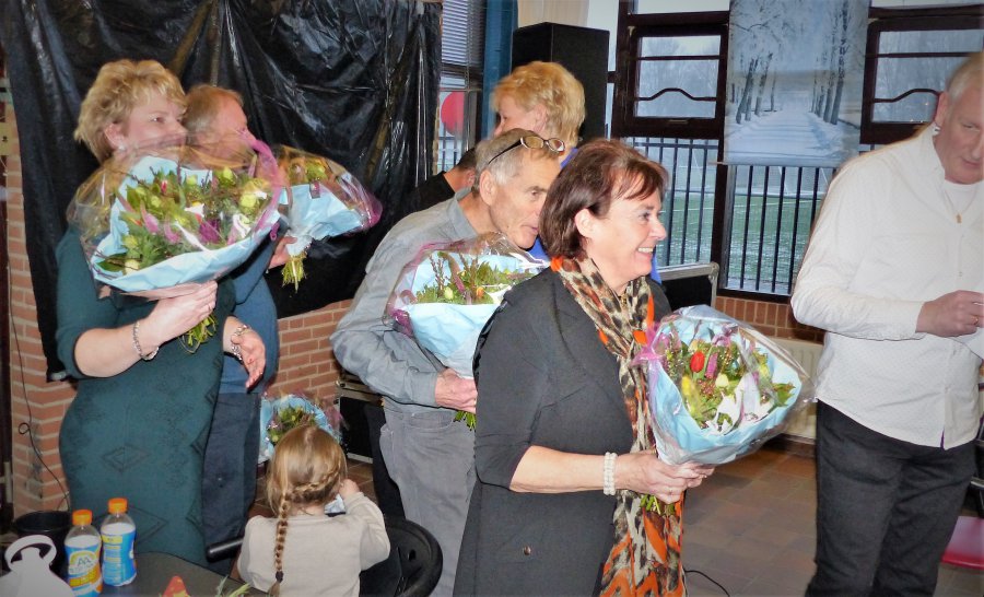 Vervolgens de mensen van de kantine, Henk en Carola en Sandra en Agatha voor hun hulp, vooral voor het schoonmaken na de wateroverlast en het regelmatig bijspringen. Ook zij krijgen bloemen.