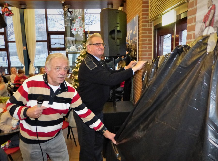 Dan geef ik tot slot de microfoon aan Hans Brouwer, zodat hij de collages met 110-jaar geschiedenis van de SV Gouda door Fred de Gruijl kan laten onthullen. "