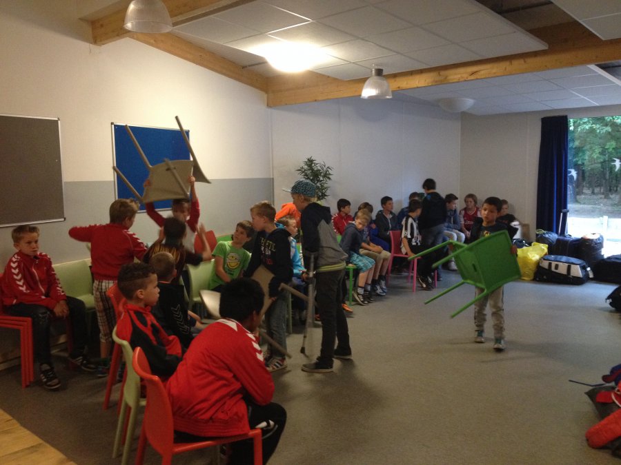 Binnen werd de kamer indeling bekend gemaakt waarna er druk met matrassen en tassen werd gesleept en de berg bagage uit de eetzaal in rap tempo de kamers in verdween.