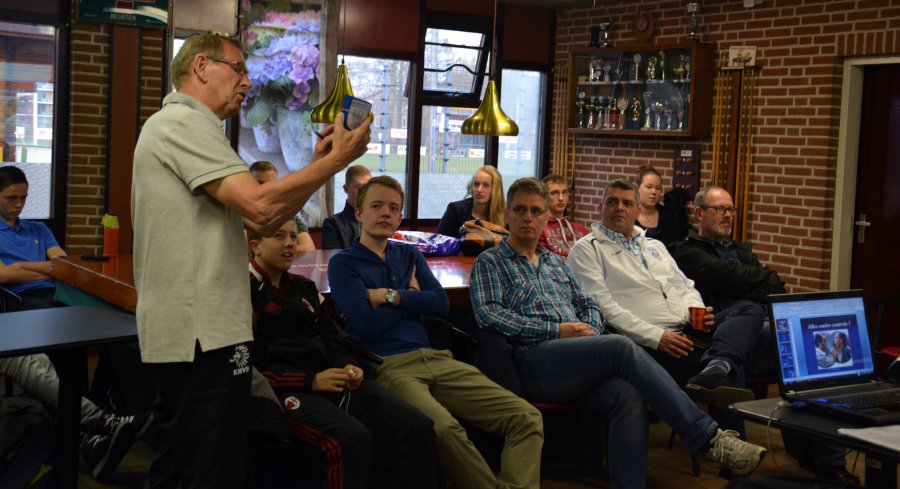 Een vijftiental cursisten volgde de opleiding, maar nog niet iedereen was helemaal klaar, maar dat is binnenkort geregeld. De grootste groep was ditmaal van Siveo '70 uit Zegveld, waaronder een dappere jongedame, die al enkele heren senioren wedstrijden tot een goed einde gebracht had. De vraag dringt zich dan meteen op, waar blijven onze meiden? Ook enige mannen van de SV Leidschenveen hadden de weg naar het Goudse weten te vinden. Dick Schuit vertelde ook nog wat over de COVS, de scheidsrechtersvereniging, die op dinsdagen traint op het grasveld van de Atletiekvereniging Gouda. Vanwege de gunstige ligging trainen daar (club)scheidsrechters uit alle windstreken en dat is prima. De aanwezigen werden uittgenodigd om ook eens langs te komen en kennis te maken, want de scheidsrechterstraining is nogal specifiek, zoals met veel interval en behoorlijk zwaar.