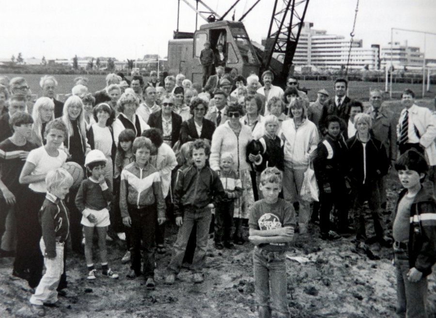 Het slaan van de eerste paal in het Groenhovenpark in 1981, met o.a. Ad (links) en Wil (midden)