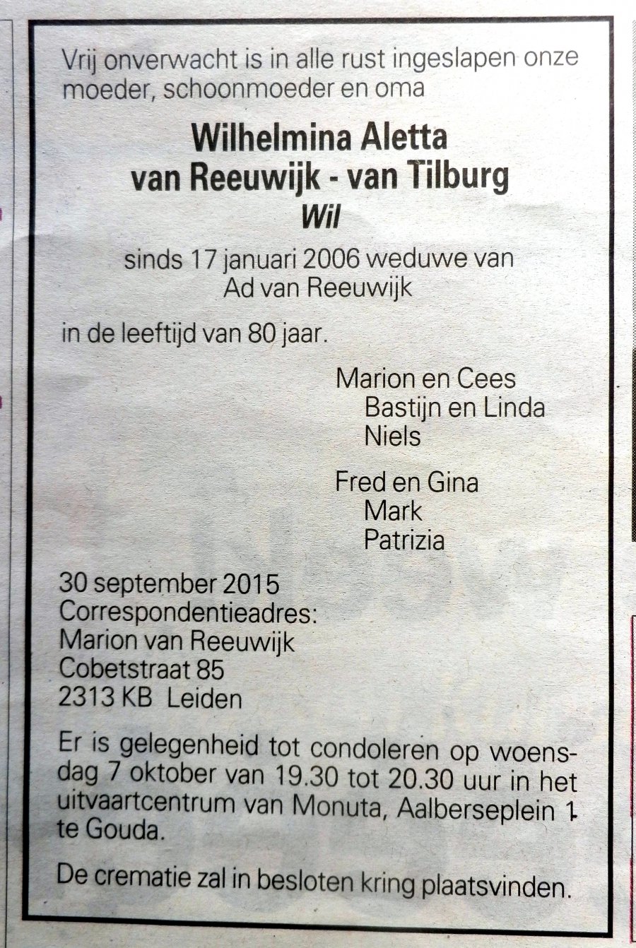Eind september is op 80 jarige leeftijd overleden Wil van Reeuwijk - van Tilburg, dochter uit een bekend en vooraanstaand Gouda-geslacht. Haar man Ad, overleden in 2006, zat vanaf 1966 in het bestuur
